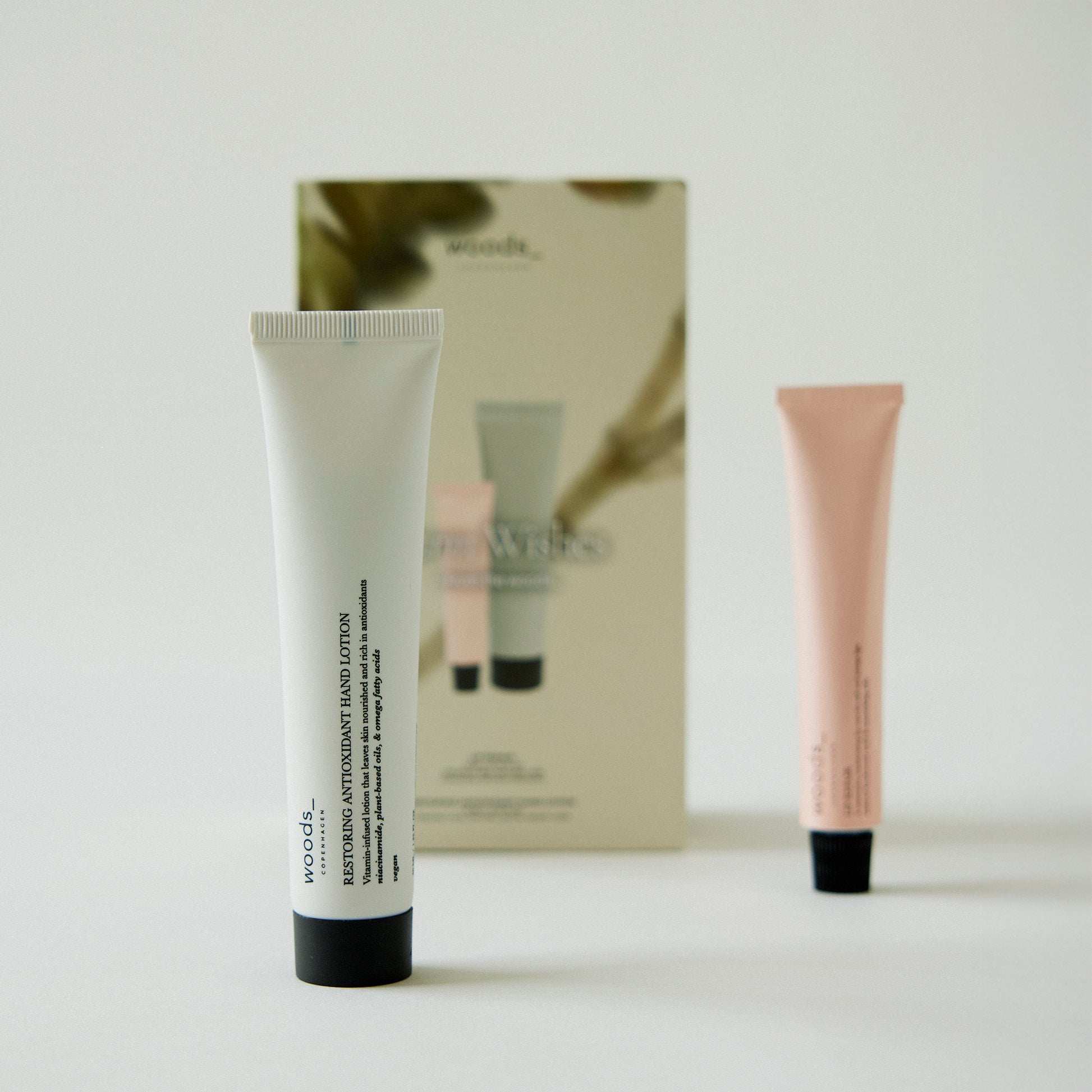 Perfect self-care on the go. This gift set effectively prevents dryness and damage thanks to protective and repairing ingredients. Lip Repair nourishes and moisturizes the lips with softening oils and hyaluronic acid – a moisture magnet that effectively attracts and retains water deep within the skin layers to smooth fine lines and leave a plump, dewy result. Restoring Antioxidant Hand Lotion is formulated with niacinamide (vitamin B3), which strengthens the skin's natural defense while minimizing the visibility of skin irregularities, such as hyperpigmentation and aging signs. The hand lotion is rich in plant-based proteins and restoring omega fatty acids that nourish the skin, leaving it more resilient toward harmful, extraneous threats. Restoring Antioxidant Hand Lotion is enriched with a subtle scent of natural lemon, iris, and orse, while Lip Repair is formulated with a fresh scent of mint.